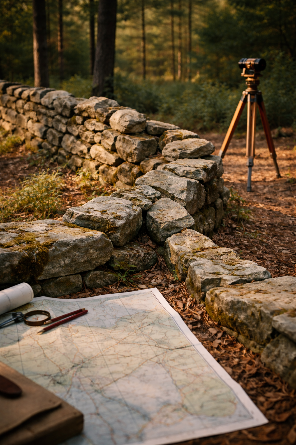 Old stone walls running through woods that haven’t been fields for generations. Boundary markers standing alone, long after the farms, houses, and paths they once referenced have disappeared. Corners marked with care for neighbors who no longer exist. Lines drawn for purposes that time has quietly erased.